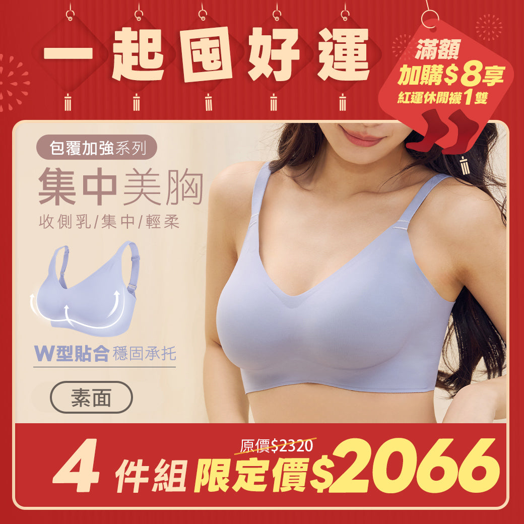 【年貨大街-4件組】集中美胸包覆加強無痕無鋼圈內衣-素面