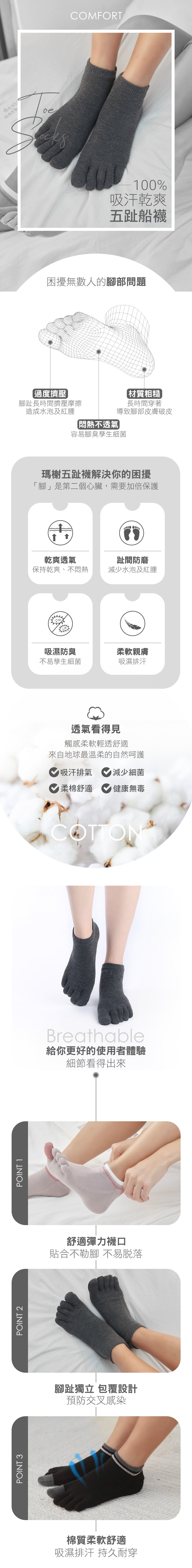 乾爽吸汗船型五趾船襪-素面