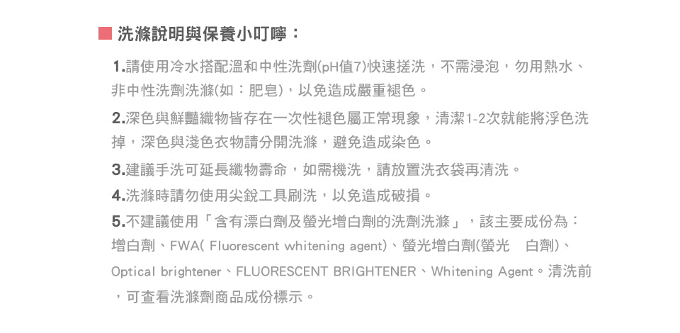 1. 請使用冷水搭配溫和中性洗劑(pH值7)快速搓洗。