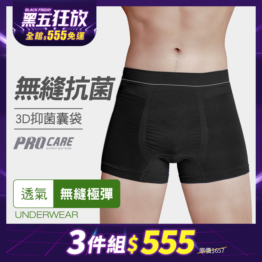 【3件組-黑五限定】無縫抗菌3D立體囊袋平口男內褲