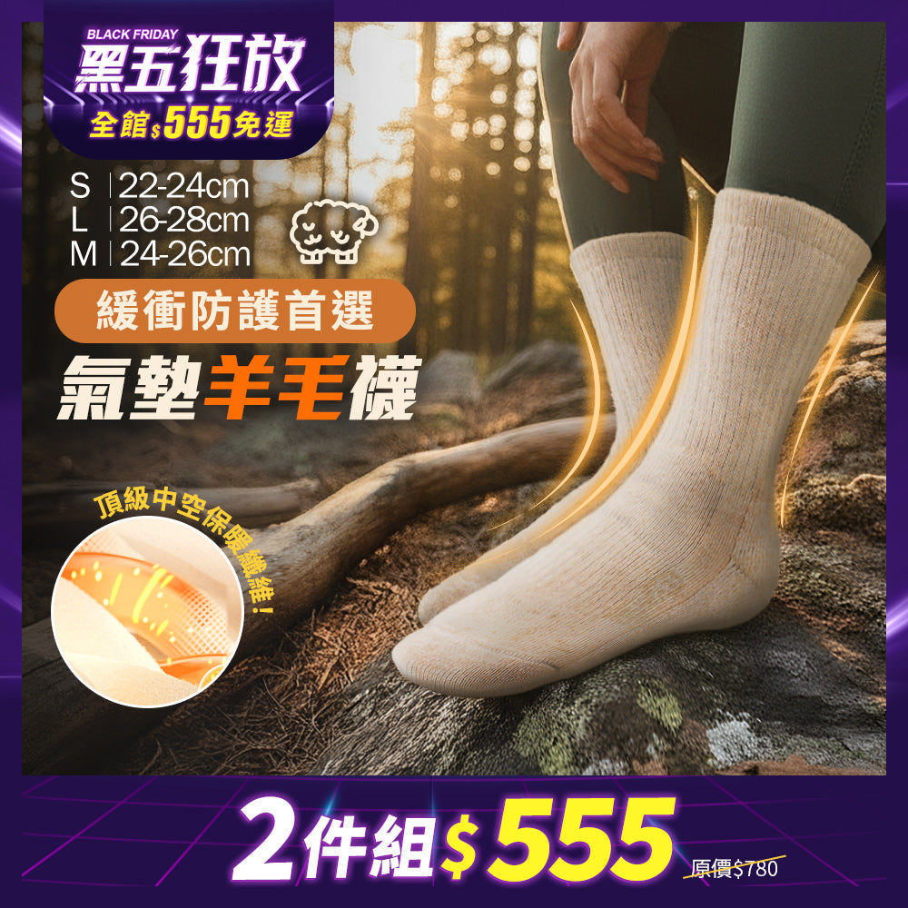 【2雙組-黑五限定】羊毛機能減壓全起毛氣墊登山襪-長襪