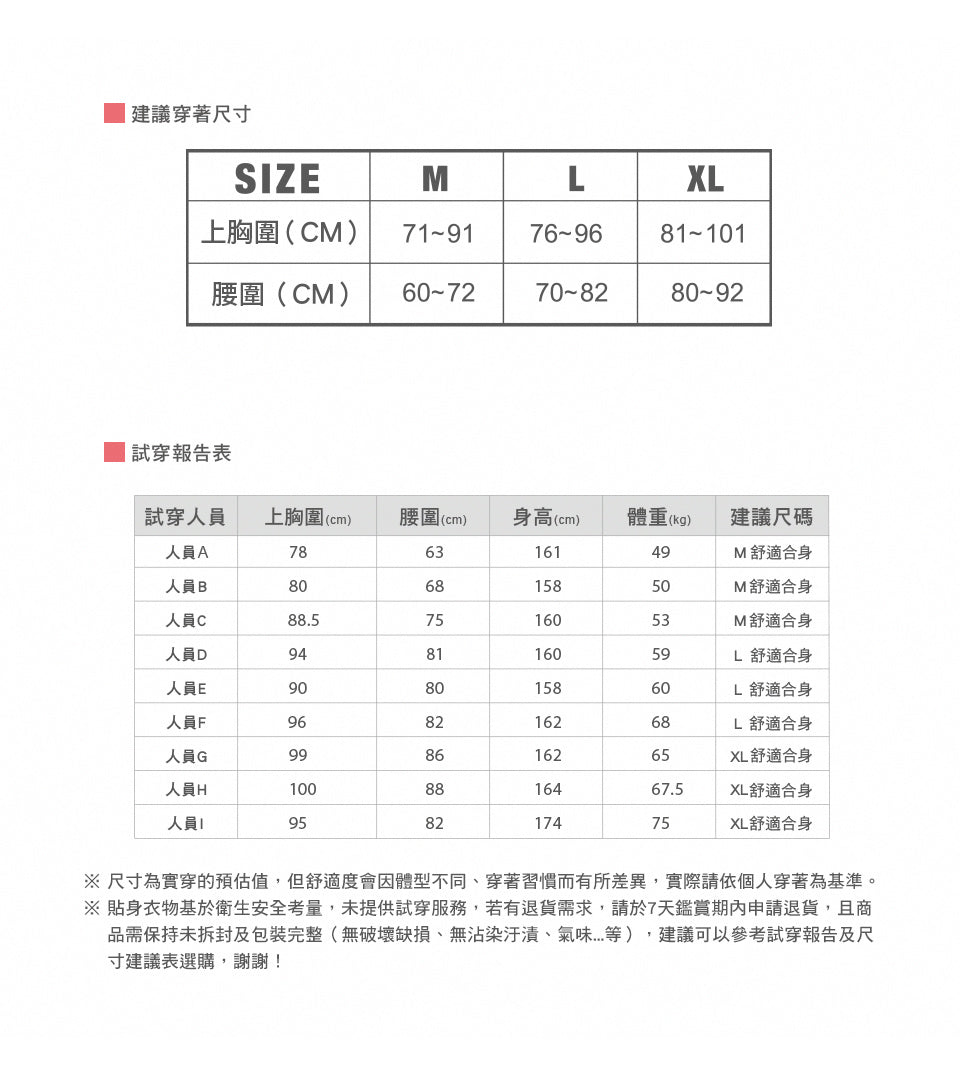 6. 為維持貼身衣物的彈性與舒適,請避免使用【非中性洗劑,例如:酵素洗劑/水晶肥皂/含氯漂白水/小蘇打...等成份】,建議選擇溫和的中性洗劑。首次清洗如有吐色或油感,為正常現象,沖洗乾淨即可安心穿著。